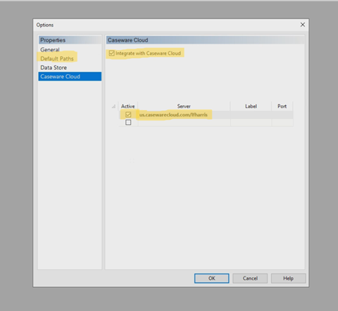- If using Caseware Cloud: Options > Caseware Cloud: verify Integrate with Caseware Cloud and the correct server is active.