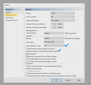 - Options > General: set Auto-delete local copy to Yes and enable Allow creation of multiple synchronized copies.