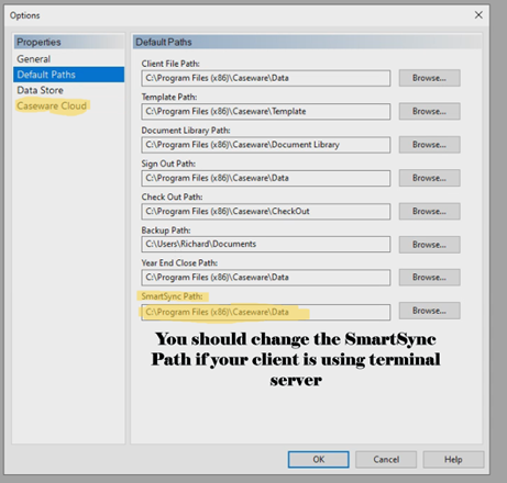 Use this when Caseware Working Papers is installed on a Terminal Server (Remote Desktop Server) and users are experiencing file lockups or are able to browse each other’s SmartSync folders.